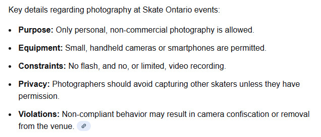 Please note: Professional, large lens cameras, tripod are restricted at Skate Ontario events.